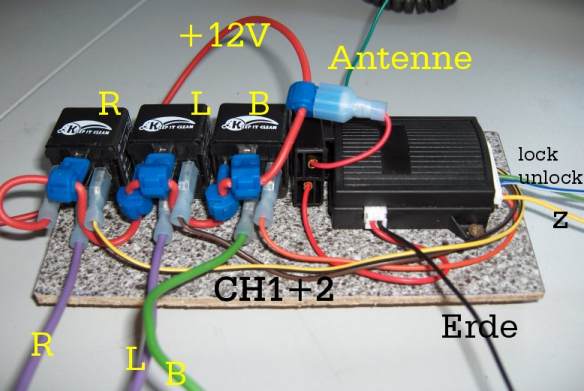 ![]() Von Toby Peterson bekommt man geliefert: Empfangsmodul mit insgesamt 8! Kanälen mit kleinem Sicherungskästchen (direkt daneben), 3 Relays, 2 Fernbedienungen, Sack voll Quetsch-Verbundungen und -Steckern ... (und dann noch die Teile, die in die Türen eingebaut werden... steht weiter unten). Die beliegende Einbauanleitung ist wirklich gut verständlich. Ich hab's als Laie gepackt, das Ding läuft!!! Ich hab das ganze Zeug auf eine Holzplatte geschraubt.