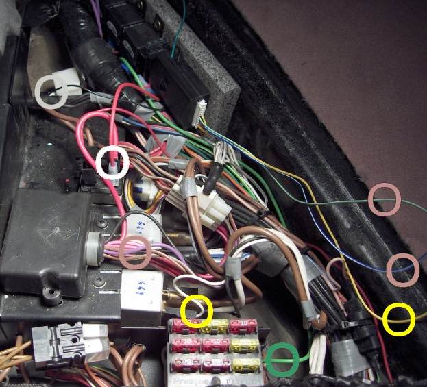 der GEGENSEITE!!!) grossen Stecker lösen. ![]() Mit Ohm-Meter dieses in der Tür abgezwickte Kabel identifizieren und aus grossem Stecker entfernen (hatte bei mir kleinen Zettel). Mit Ausgang R verbinden. ![]() In dieser Ecke ist man dann fertig. |