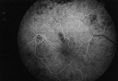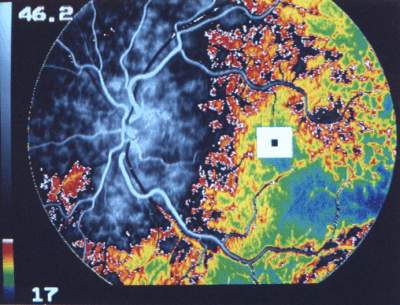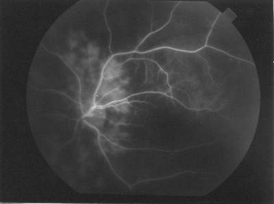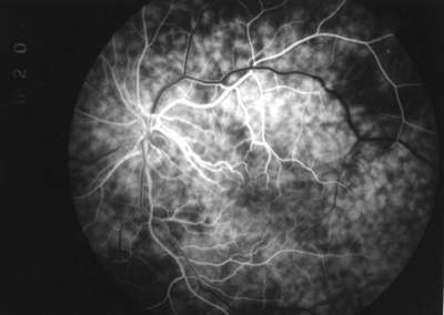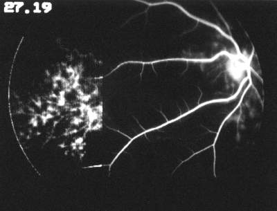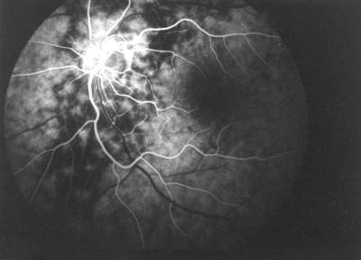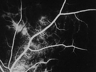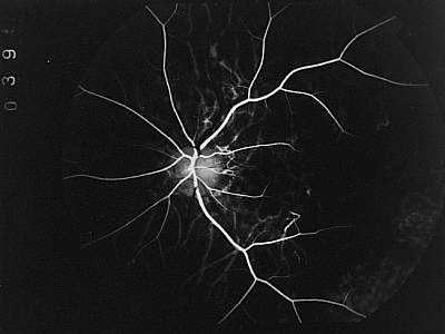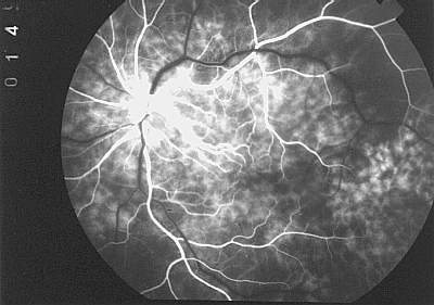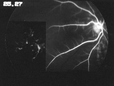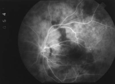 Die Spätphase der Aderhautfluoreszenz unterscheidet sich nicht mehr von der normalen Fluoreszenzangiographie. In der diffusen Färbung der Choriokapillaris stellen sich die jetzt fluoreszeinfreien Aderhautgefäße als unscharfe, dunkel Streifen dar (Negativ-Darstellung der Aderhautgefäße). Fluoreszenzangiographische Befunde, wie z.B. pathologische Hyperfluoreszenzen oder Fensterdefekte, können genauso wie bei der konventionellen Angiographie erhoben werden (Abb. 15) . |