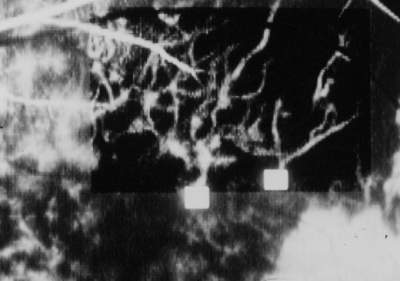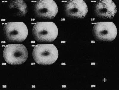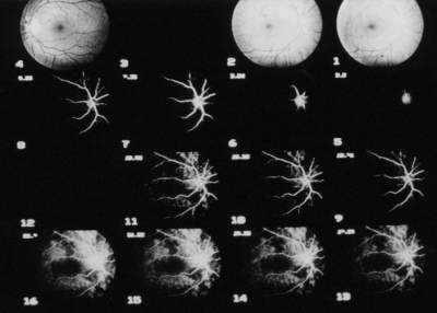 Unmittelbar nachdem die Aufnahme der FLADOP abgeschlossen ist, können die einzelnen Bilder des Angiogramms einer digitalen Bildverarbeitung zugeführt werden (Abb. 16) . Die Netzhautgefäße werden, soweit keine Trübungen der brechenden Medien vorliegen, angiographisch stets kontrastreich abgebildet. Da die Fluoreszenz der Aderhautgefäße durch die darüberliegenden Strukturen (Netzhaut mit Pigmentepithel und Choriokapillaris) sowohl absorbiert als auch gestreut wird, kommen diese nur unscharf zur Darstellung. | ||||||||||||||||||||||||||||||||||||||||