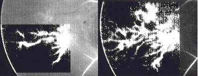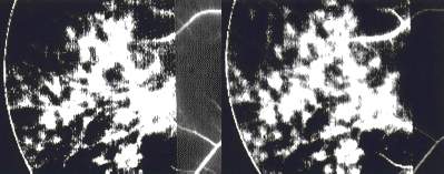. Vor allem in den frühen Phasen der FLADOP ist die Anpassung von Kontrast- und Helligkeitswerten von großem Vorteil. Der erste Einstrom des Fluoreszeins in die Aderhaut ist sehr diskret und auf der ursprünglichen Aufnahme kaum zu erkennen (Abb. 19) . Nach der Bearbeitung mit 'Contrast Enhancement' wird es möglich die skleralen Durchtrittsstellen der Ziliargefäße sichtbar zu machen. Wie sich die Darstellung der Füllung einzelner Aderhautlobuli durch Kontrast- und Helligkeitsanpassung verbessern läßt, wird in Abb. 20 demonstriert. In diesen Aufnahmen findet sich im peripapillären Gebiet eine bereits fortgeschrittene lobuläre Füllung. Zunächst haben wir mit der Funktion Contrast Enhancement das gesamte Bild so eingestellt, daß sich diese peripapilläre Fluoreszenz optimal darstellt. In einem weiteren Schritt wurde der Bildausschnitt temporal der Makula ausgewählt und einer weiteren Bearbeitung unterzogen. Dadurch wird es möglich, mehrere Aderhautgebiete von völlig unterschiedlicher Fluoreszenz auf ein und derselben Abbildung in optimierter Weise zur Darstellung zu bringen. Auch zeigt sich, wie die Qualität der fluoreszenzangiographischen Wiedergabe choroidaler Strukturen durch die Anwendung digitaler Bildverarbeitungsprozesse verbessert werden kann. |