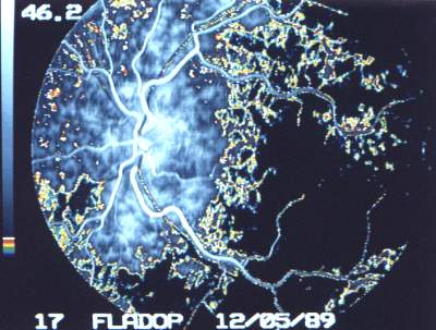ermöglicht. Um eine weitere Verbesserung der Abbildung dieser Strukturen zu erreichen, haben wir 5 FLADOP's mit dem digitalen Funduskamera-System DFC-512 (Ophthalmic Imaging Systems, OIS) aufgezeichnet, und einer digitalen Bildverarbeitung unterworfen. |