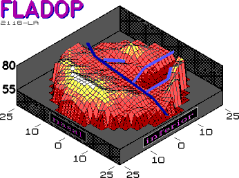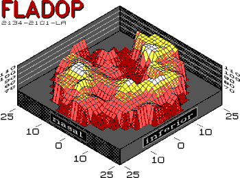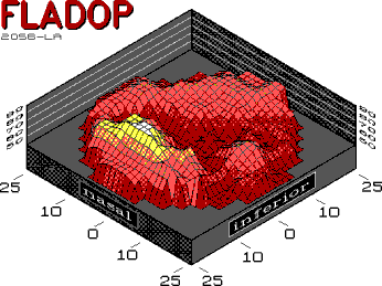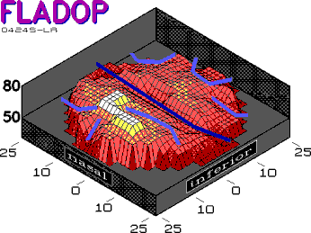 Bei bestimmten intraokularen Drucken kann man beobachten, daß das Zentrum eines Aderhautsegments bereits die diffuse Füllungsphase der Aderhaut zeigt, während zum Rande des Segments hin noch einzelne Lobuli differenziert werden können (lobuläre Füllungsphase). Die angrenzende Wasserscheide zeigt die Füllungsphase der großen Aderhautgefäße. Die Übergänge zwischen den Phasen sind fließend (Abb. 43) . Diese konstante Aufeinanderfolge der Füllungsphasen gilt nicht nur für den Füllungsstatus des Fundus bei einem bestimmten intraokularen Druck (räumliche Folge der Füllungsphasen), sondern auch für das Füllungsverhalten eines definierten Aderhautbezirks im Verlauf der Drucksenkungsphase (druckabhängige Folge der Füllungphasen). Sowohl für die Entwicklung der Perfusionsparameter als auch für die Erstellung der Aderhautprofile haben wir uns an der lobulären Füllungsphase der Choriokapillaris orientiert. Da die Perfusionsdruckspanne der Aderhaut bei augengesunden Probanden besonders kurz ist, kann man erwarten, daß die Aderhautprofile ein entsprechend flaches Relief zeigen. Die in den folgenden Kapiteln gezeigten Aderhautprofile besitzen für ihre Z-Achse einen identischen Maßstab und können somit direkt miteinander verglichen werden. Als Beispiel seien hier die Aderhautprofile zweier augengesunden Probanden gezeigt (Abb. 44 + 45 ). Die Profile sind entsprechend der kleinen Aderhautperfusionsdruckspannen (AH-PDS) sehr flach. Die gleichmäßige Ausbreitung des Fluoreszeins in den Segmenten ergibt ein homogenes Aderhautprofil, d.h. es sind keine verzögerten Aderhautbezirke oder Wasserscheiden zu erkennen. Die AH-PDS liegt bei 14 mmHg bzw. 20 mmHg (Abb. 44 + 45 ). |