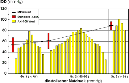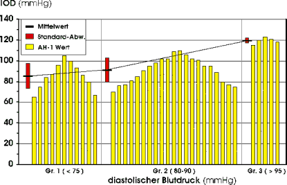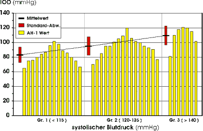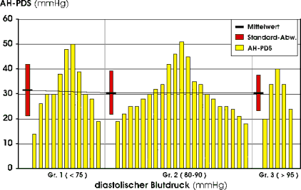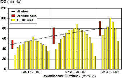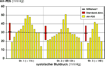Um den Einfluß des arteriellen Blutdrucks auf den AH1-Wert zu überprüfen, wurde das Gesamtkollektiv zusammengefaßt und getrennt für systolische und diastolische Blutdruckwerte in 3 Gruppen eingeteilt ( Tab. 8 , Abb. 39). Mit Zunahme des systolischen Blutdrucks erhöht sich der mittlere AH1-Wert von 82,9 mmHg (Gruppe S1) über 95,3 mmHg (Gruppe S2) auf 110,0 mmHg (Gruppe S3). Unter Berücksichtigung des diastolischen Blutdrucks steigt der mittlere AH1-Wert von 85,3 mmHg (Gruppe D1) über 91,2 mmHg (Gruppe D2) auf 119,0 mmHg (Gruppe D3). |