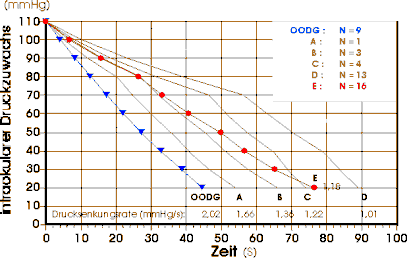 wiedergegeben. Bei einem schnelleren Druckausgleich (Kurve A und OODG in Abb. 52) kann man einen sehr raschen Einstrom des Fluoreszeins in die retinalen Gefäße beobachten. Nach bereits 4-5 Pulsationsphänomenen sind die retinalen Arteriolen bis über den angiographischen Fundusausschnitt gefüllt. Auch die Anfärbung des choroidalen Gefäßbettes vollzieht sich zu rasch und ist somit oft schwer zu beurteilen. Vor allem für die Analyse der tieferliegenden Aderhautgefäße erweist es sich als sinnvoll, den intraokularen Druck so langsam wie möglich auszugleichen (Kurve C, D und E in Abb. 52). Je länger der Einstrom des Fluoreszeins in die Choriokapillaris und die dortige interstitielle Anreicherung verzögert wird, umso deutlicher stellen sich die Aderhautgefäße der Haller'schen und Sattler'schen Schicht dar. Ebenso können während der lobulären Füllungsphase die einzelnen Aderhautsegmente und die entsprechenden Wasserscheiden besser differenziert werden. Eine Verlängerung der Drucksenkungsphase ist außerdem erwünscht, da die zu beurteilenden angiographischen Phänomene in Abhängigkeit vom momentan herrschenden Augeninnendruck beschrieben werden sollen. Bei schnellerem Druckausgleich (OODG, Kurve A in Abb. 52) erkennt man anhand des raschen Voranschreitens der Farbstofffront in den verschiedenen Gefäßabschnitten, daß die Verteilung des Fluoreszeins nicht ausschließlich durch den intraokularen Druck, sondern auch durch das Blutflußvolumen bestimmt wird. Andererseits sollte die Dauer der Drucksenkungsphase nicht unnötig ausgedehnt werden, um keine vermeidbaren Belastungen des Auges zu verursachen. Auch wird die Saugnapfokulopression von den Patienten nicht unbegrenzt toleriert. In mehreren Eigenversuchen (3 FLADOP und 3 Saugnapfokulopressionen ohne Angiographie) konnten wir feststellen, daß eine Drucksenkungsphase über 100 Sekunden als unangenehm empfunden wird. Ist dagegen die Drucksenkungsphase nach weniger als 80 Sekunden abgeschlossen, so wird die Saugnapfokulopression von den Probanden als kaum störend beschrieben. Wir finden eine Drucksenkungsrate von 1,18 mmHg/s (Kurve E in Abb 52) als besten Kompromiss zwischen geringster Belastung des Patienten einerseits und Optimierung der angiographischen Darstellung andererseits. Demgegenüber gleicht der Okulo-Oszillo-Graph die intraokulare Druckerhöhung fast zweimal so schnell aus (2,02 mmHg/s, Kurve OODG in Abb. 52). |